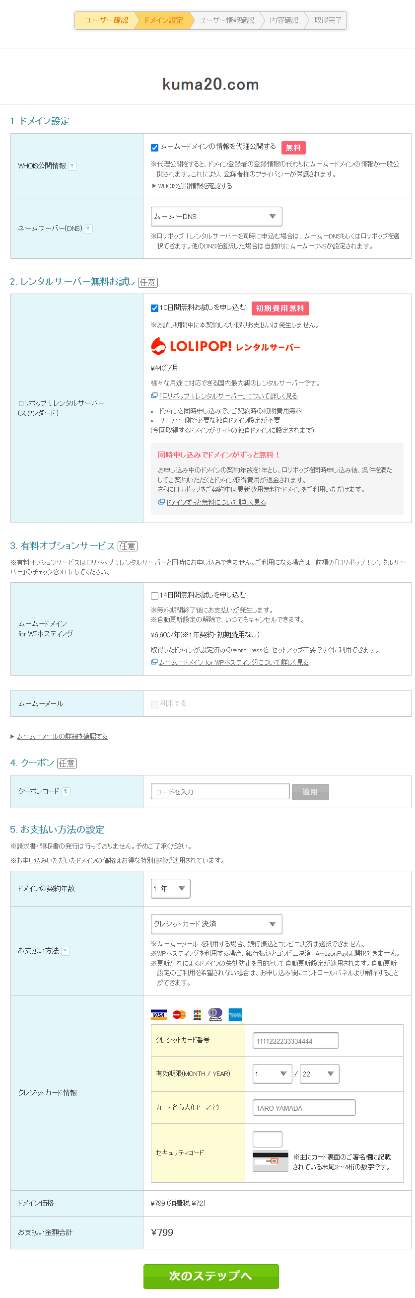 1.ドメイン設定、2.レンタルサーバー無料お試し、3.有料オプションサービス4.クーポンは何も入力せず、すべてそのまま変更なしでOKです。