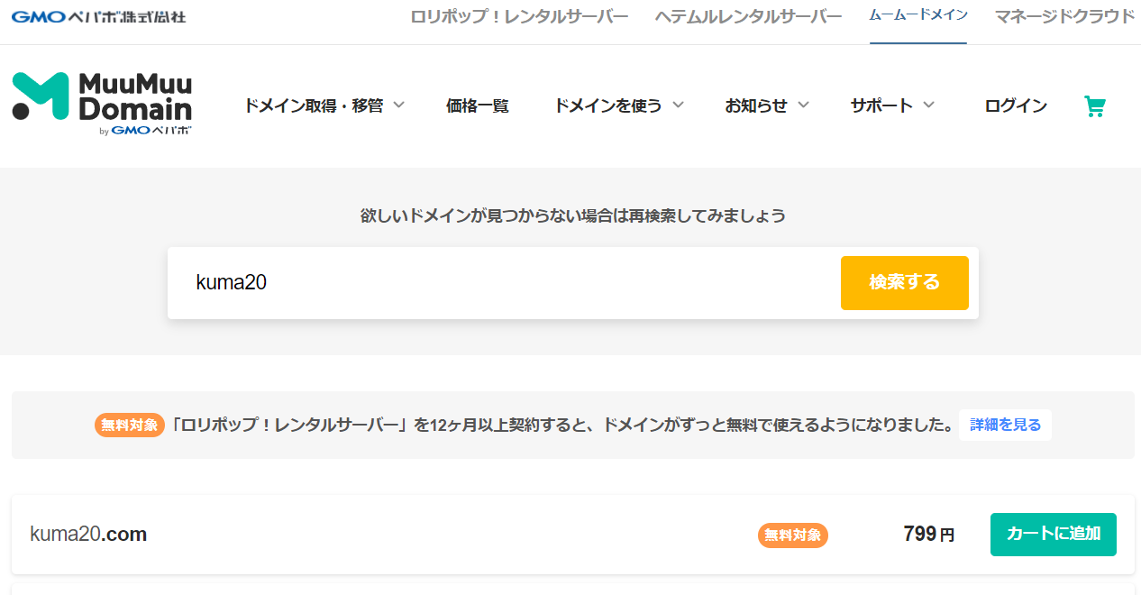 そこで第2候補「kuma20.com」で検索してみると、検索結果に「カートに追加」の表示があるのでドメイン名は使用可能です!