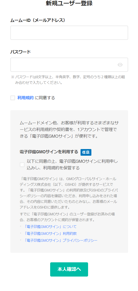 初めて利用する場合は「ムームードメインのアカウントをお持ちでない方は、新規ユーザー登録を行ってください」が表示されますので、新規登録をしましょう。