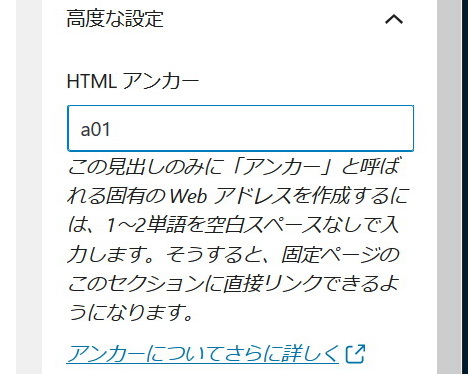 2.右サイドバー下方「高度な設定」の「HTMLアンカー」にアンカー文字を入力します。