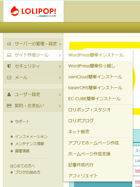 メニューの「サイト作成ツール」から「WordPress簡単インストール」をクリックします。