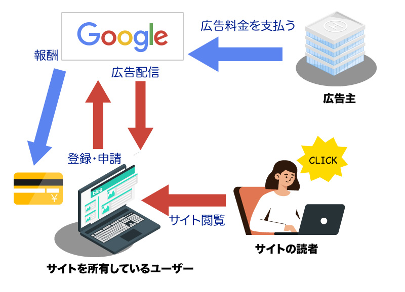 アドセンスは、Google 広告の広告を、ウェブサイトに配信するプログラムです。エンドユーザーが広告をクリックした回数や広告の表示回数に基づき、Googleからサイト運営者に報酬が支払われます。